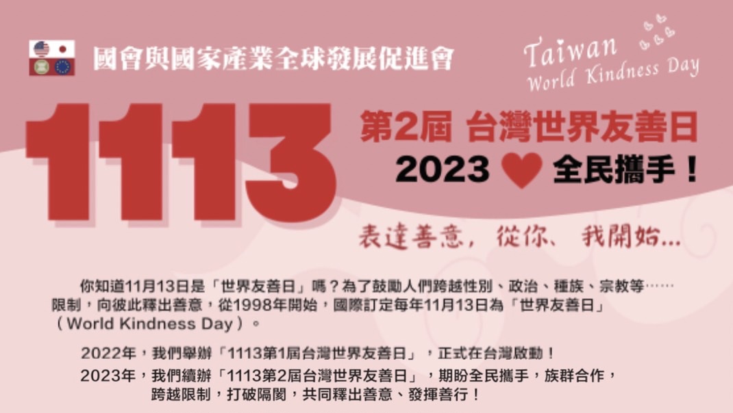 「1113第1屆台灣世界友善日」正式在台灣啟動,2023年「國會與國家產業全球發展促進會」將於11月12日(星期日)上午9時30分至下午1時30分假新北市土城綜合運動場之音樂舞台區,續辦「1113第2屆台灣世界友善日」活動暨「友善大使」頒獎典禮,期盼全民攜手,族群合作,共同釋出善意、發揮善行!