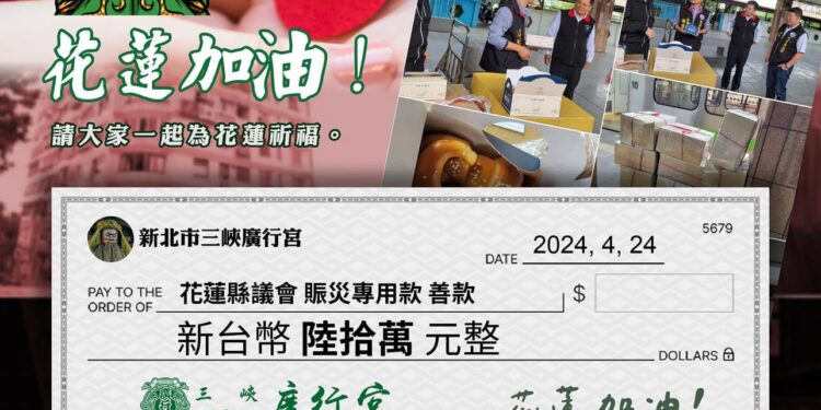三峽廣行宮關聖帝君廟主委黃騰霆繼賑災之初,捐贈金牛角慰勉花蓮縣警消人員之後,今(4/24)日再次結合北桃園玄天宮功德會 創會長周國福、理事長鄭清火,共同發揮善心,捐助120萬元,請花蓮縣議會議長張峻繼續協助災民度過難關。