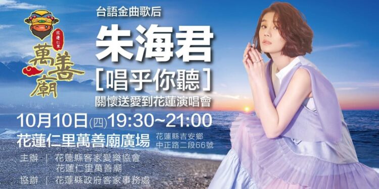 原定於胖叔貓音樂展演廳舉行的朱海君「唱乎你聽」關懷送愛到花蓮演唱會,因為驚人的訂票人潮已然暴滿,主辦單位決定不讓花蓮縣的民眾失望,將活動擴大至花蓮仁裡萬善廟前廣場,於戶外大型舞臺舉行,免票入場!這個充滿愛心的演唱會將於10月10日(星期四)晚上19:30至21:00正式開演。
